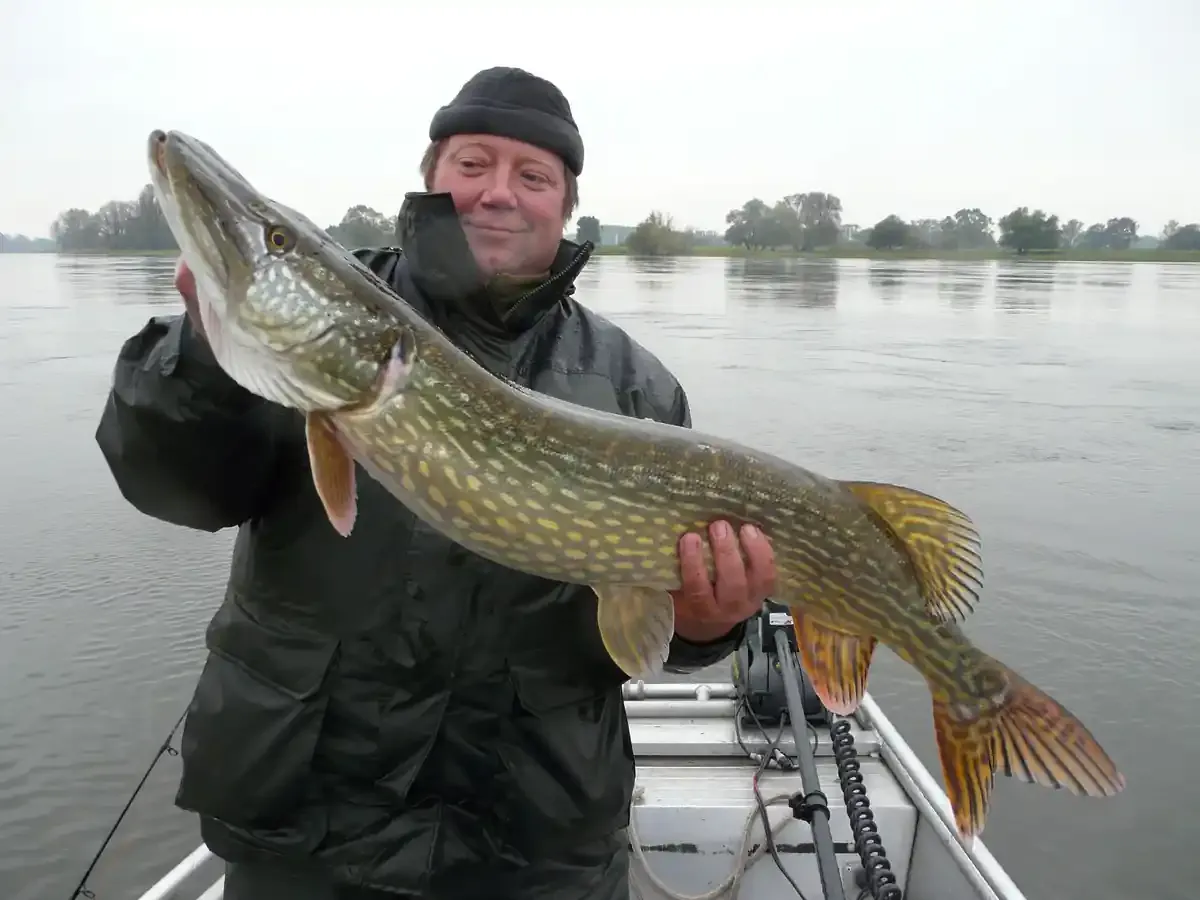 - Täuschungsmanöver: Ein Einschlag direkt unter dem Boot ließ uns sofort an einen kapitalen Stachelritter glauben. Doch nach den ersten Fluchten zeigte sich die Silhouette eines fetten 95 cm Elbhechts. Ein kampfstarker Esox, der die Bremse ordentlich zum Singen brachte!