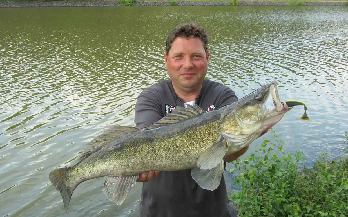 12slider-sommerzande-fangfoto-elbe - Beim Zanderangeln an der sommerlichen Elbe freut sich ein Angler über den Fang eines Zanders