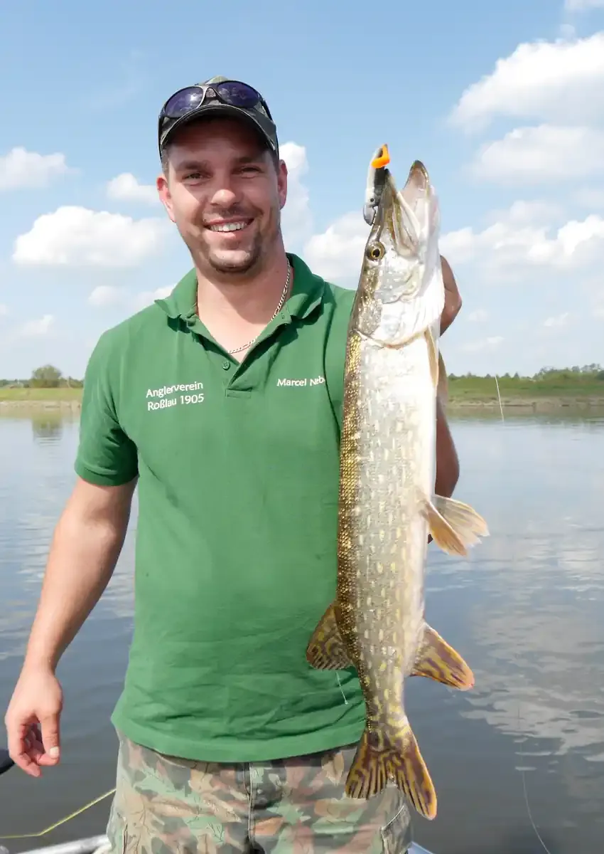 Ein Sommerhecht beim Zanderangeln an der Elbe-Sommerhechte sind in der Elbe die Ausnahme. Die Angelzeit auf Hecht in der Elbe ist eindeutig der Herbst, wenn das Wasser sichtiger wird.