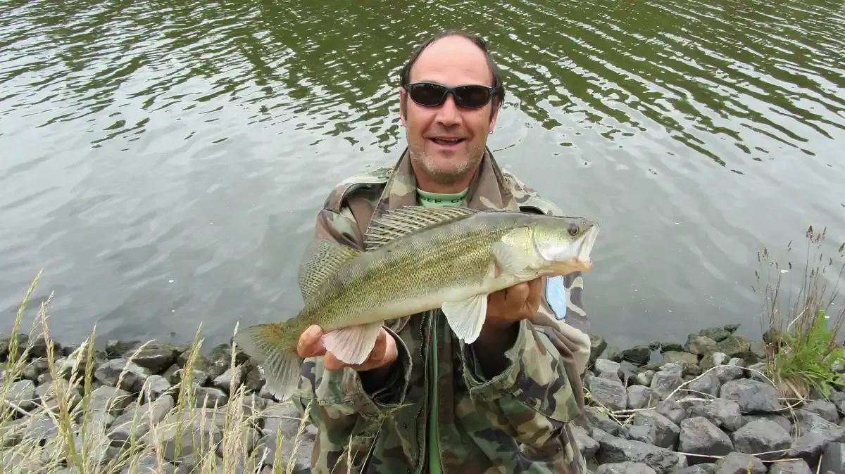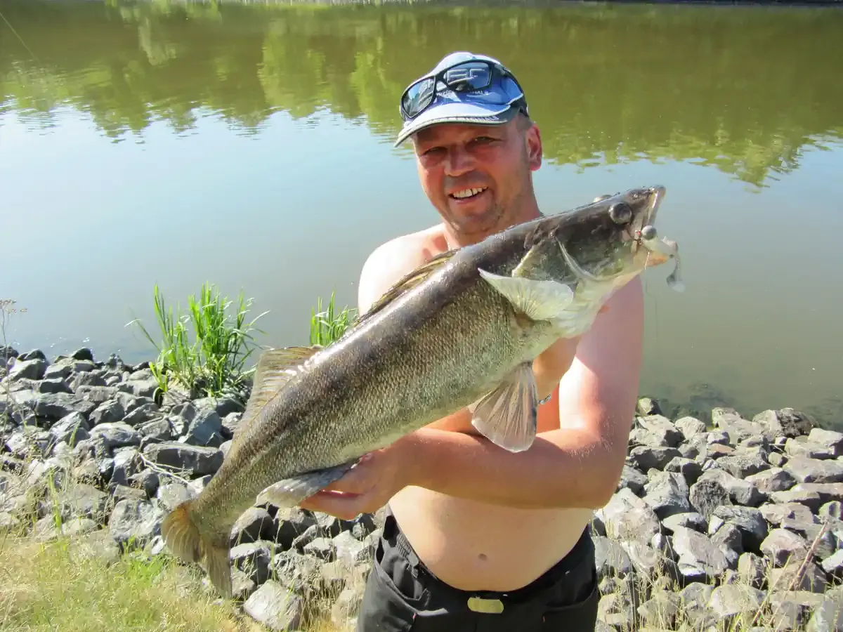 Bei herrlichen Sommerwetter beim Zander angeln in der Elbe kam der Biss direkt vor den Füßen an der Steinpackung