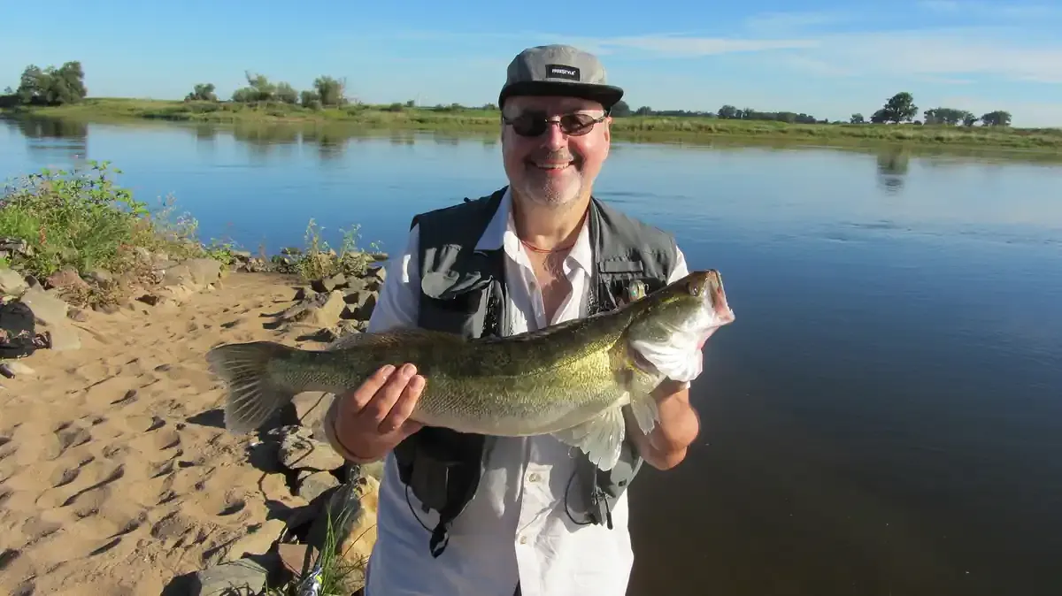 Stolzer Angler präsentiert seinen Zanderfang am ElbuferWels beim Zanderangeln auf gummifisch an der Elbe